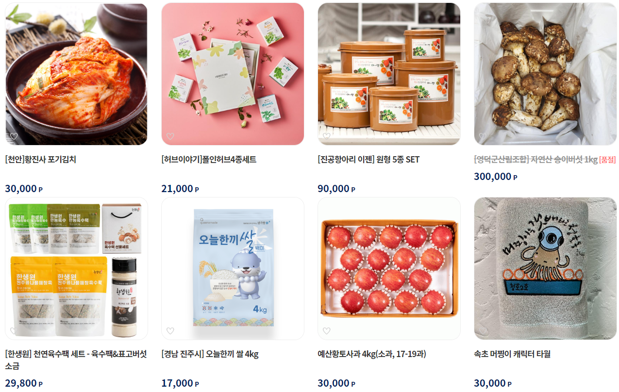 돌산갓김치, 횡성한우, 영광굴비, 임실치즈, 장수사과, 풍천장어, 상주곶감, 제주한라봉 등 다양한 상품이 있습니다.