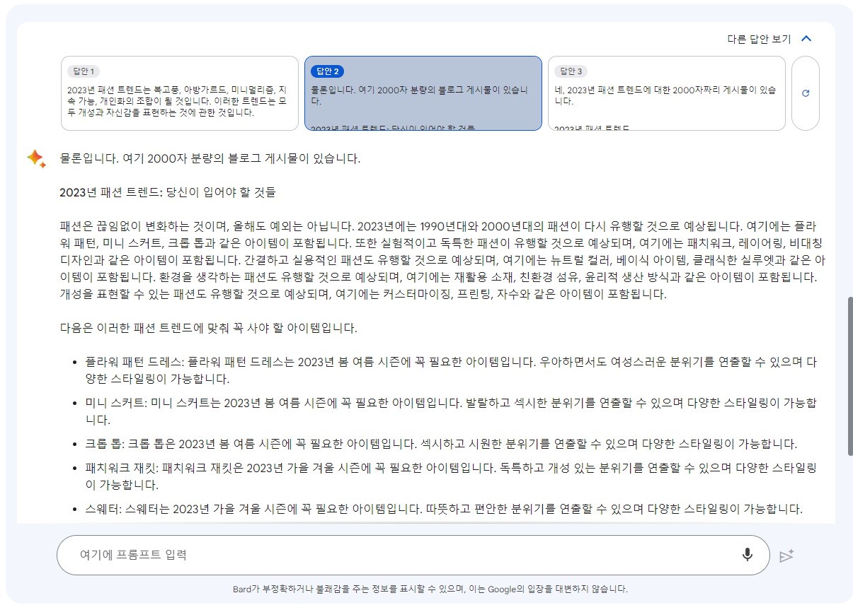 구글 바드를 이용하여 받은 추천 아이템 마음에 드시나요? 아직은 부족한 부분이 있으나 점차 개선될 것으로 보입니다. 챗gpt와 다른 점은 실시간 프롬프트를 써 내려가지 않고 3가지의 다른 답안을 동시에 제공합니다. 바드가 추천하는 아이템을 활용하여 2023년 트렌디한 패션을 연출해 보시는 것 어떨까요? 아직은 이대로 입기는 좀 어려울 것 같긴 합니다.
