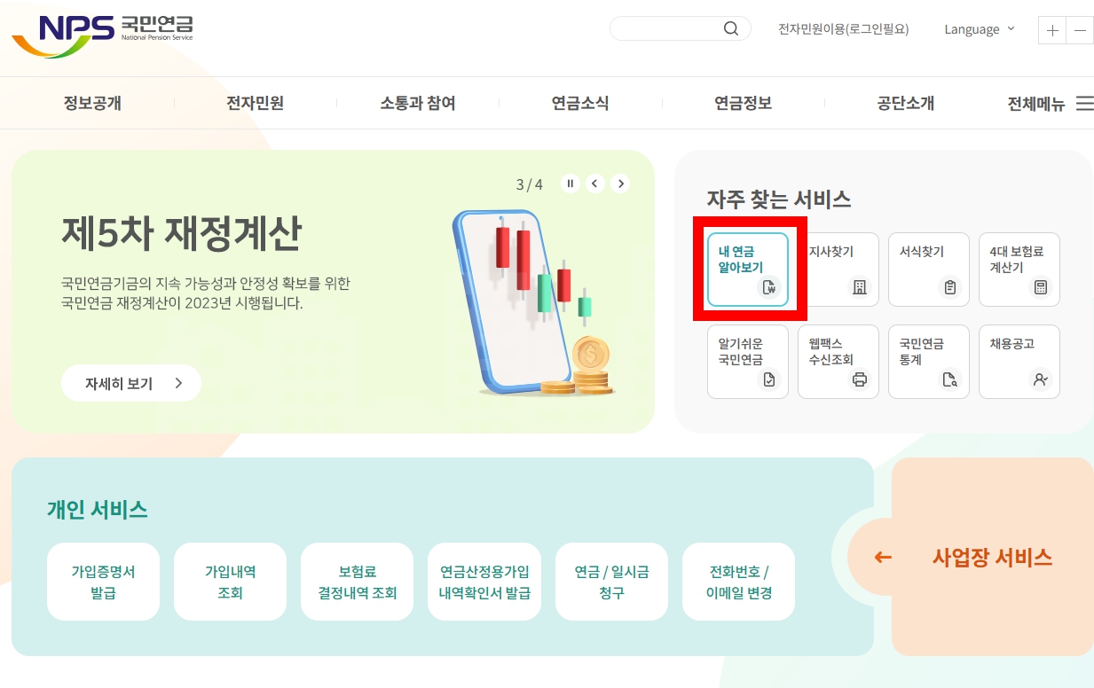 - 홈페이지 상단의 '내 연금정보' 메뉴를 클릭합니다.