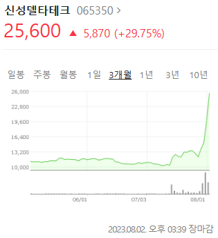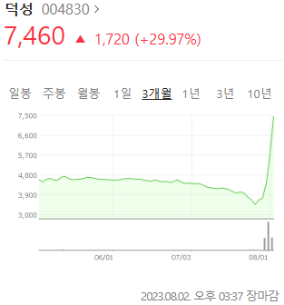 8월 2일 기준 덕성(29.97%), 신성델타테크(29.75%), 모비스(27.16%), 고려제강(25.46%), 대창(22.63%), 원익피앤이(22.03%), 서원(18.57%), 티플랙스(16.86%), 국일신동(15.82%) 등이 일제히 오르고 있습니다.