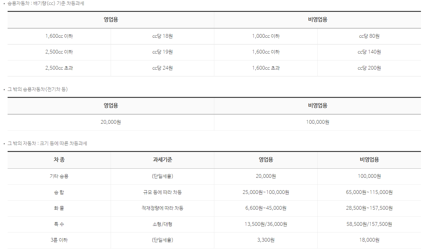 자가용 기준 승합차는 매년 6만 5000원, 화물차는 2만 8500원을 고정적으로 내야 합니다. 비영업용 승용차의 경우 1000cc 이하는 cc당 80원, 1600cc 이하 cc당 140원, 1600cc 초과 cc당 200원 세율이 적용됩니다.