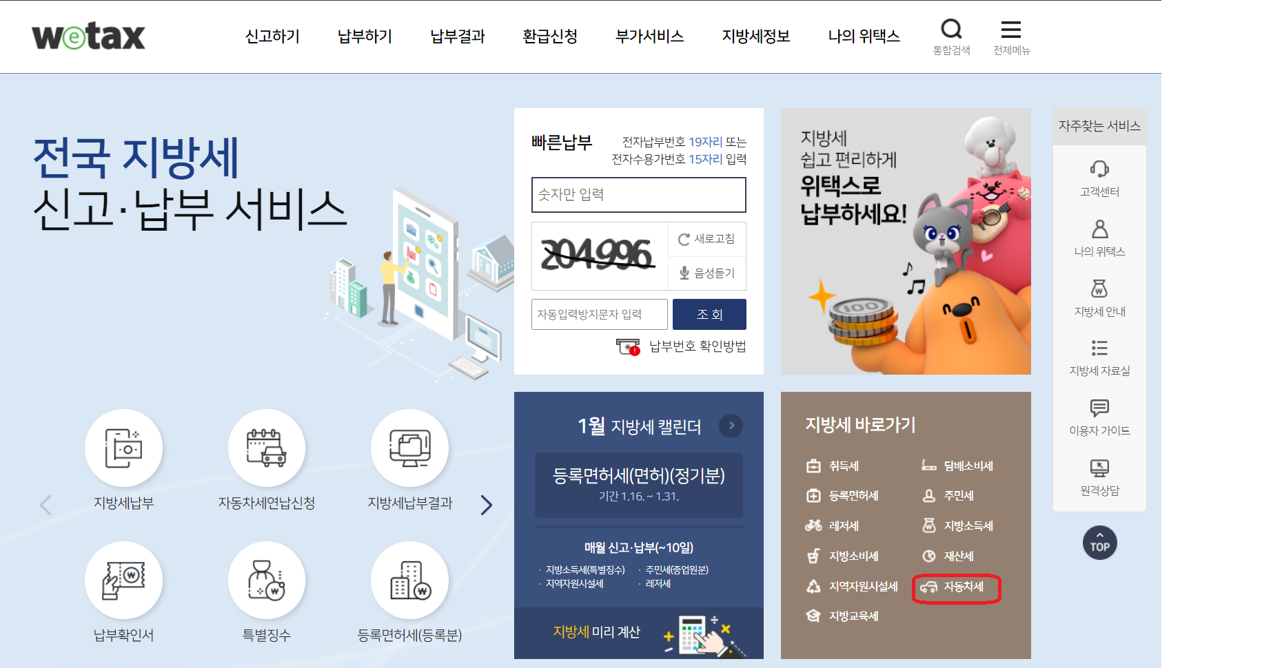 오른쪽 하단 '지방세 바로가기' - '자동차세'를 눌러 조회가 가능합니다.