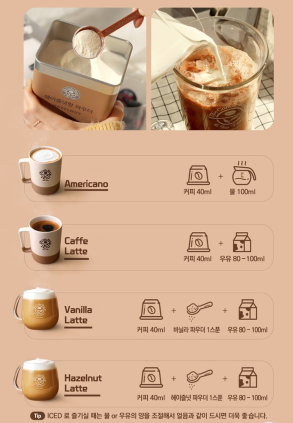 - 헤이즐럿라테 : 커피 40ml + 헤이즐럿파우더 1스푼 + 우유 80~100ml
