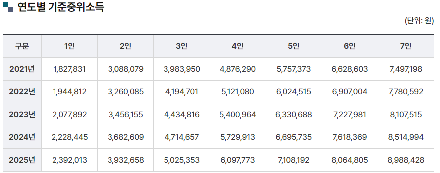 따라서, 2025년 기준 중위소득 210%는 다음과 같습니다.