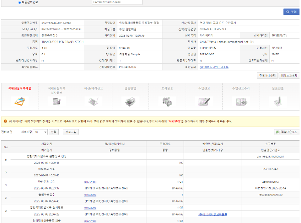 운송장 번호를 입력한 후, ‘조회’ 버튼을 클릭합니다. 이때 시스템이 해당 물품의 통관 상태와 배송 진행 상황을 보여줍니다.
