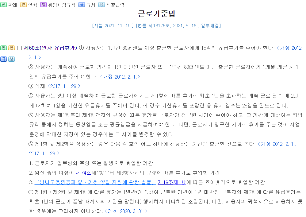 근로기준법 제60조에 연차 유급휴가에 대해 자세하게 나와있습니다.