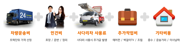 이사는 크게 차량 운송비와 인건비, 사다리차 사용료, 추가작업비와 이사날짜 등의 기타비용으로 나뉘어 있습니다. 이 외에는 별도의 비용이 발생하지 않으니 추가 비용을 요구하는지 확인이 필요합니다.