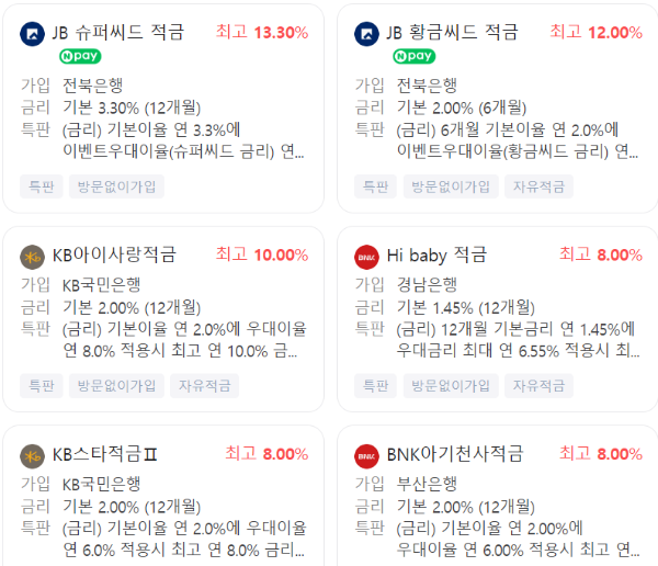 현재는 네이버 적금추천 기준으로 전북은행의 JB 슈퍼시드 적금이 가장 높은 이율을 제공하고 있습니다.