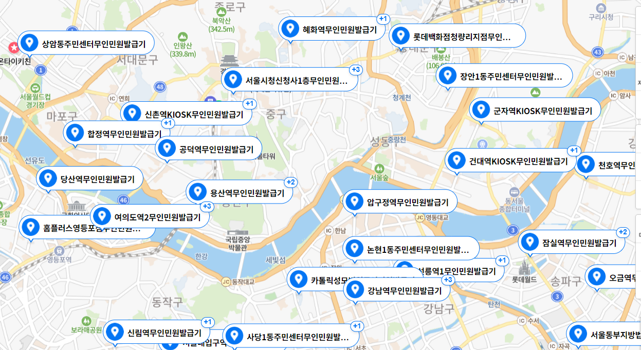 지하철이나 근처의 무인민원 발급기에서도 발행이 가능합니다. 근처 위치는 아래에서 확인하시기 바랍니다.