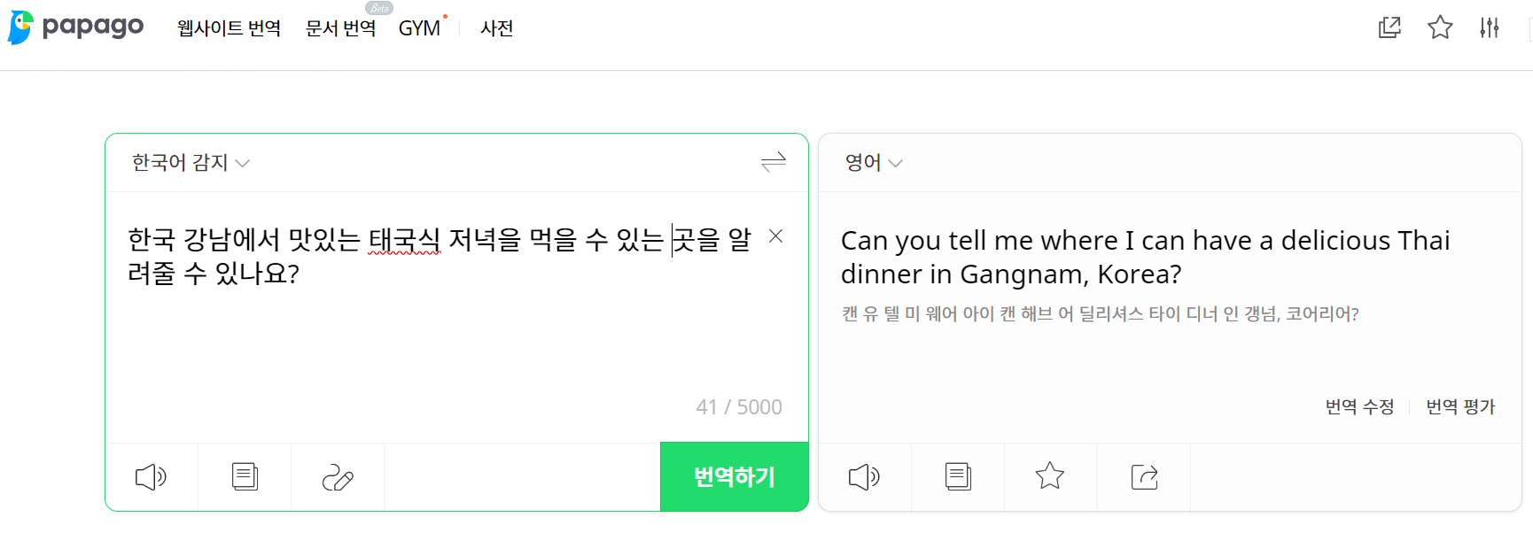 한국어로 바로 사용할 경우, 처리시간이 지연되거나 답변에 오류가 있을 수 있습니다. 보다 정확한 답변을 위해서는 영어로 질문을 하는 것이 좋습니다. 파파고나 구글번역을 이용하시면 간편하고 정확하게 대화가 가능합니다.