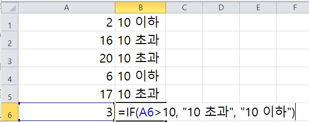 예시: A1 셀의 값이 10보다 크다면 "10 초과"라고 표시하고 그렇지 않다면 "10 이하"라고 표시하고 싶다면, =IF(A1>10, "10 초과", "10 이하") 함수를 사용합니다.