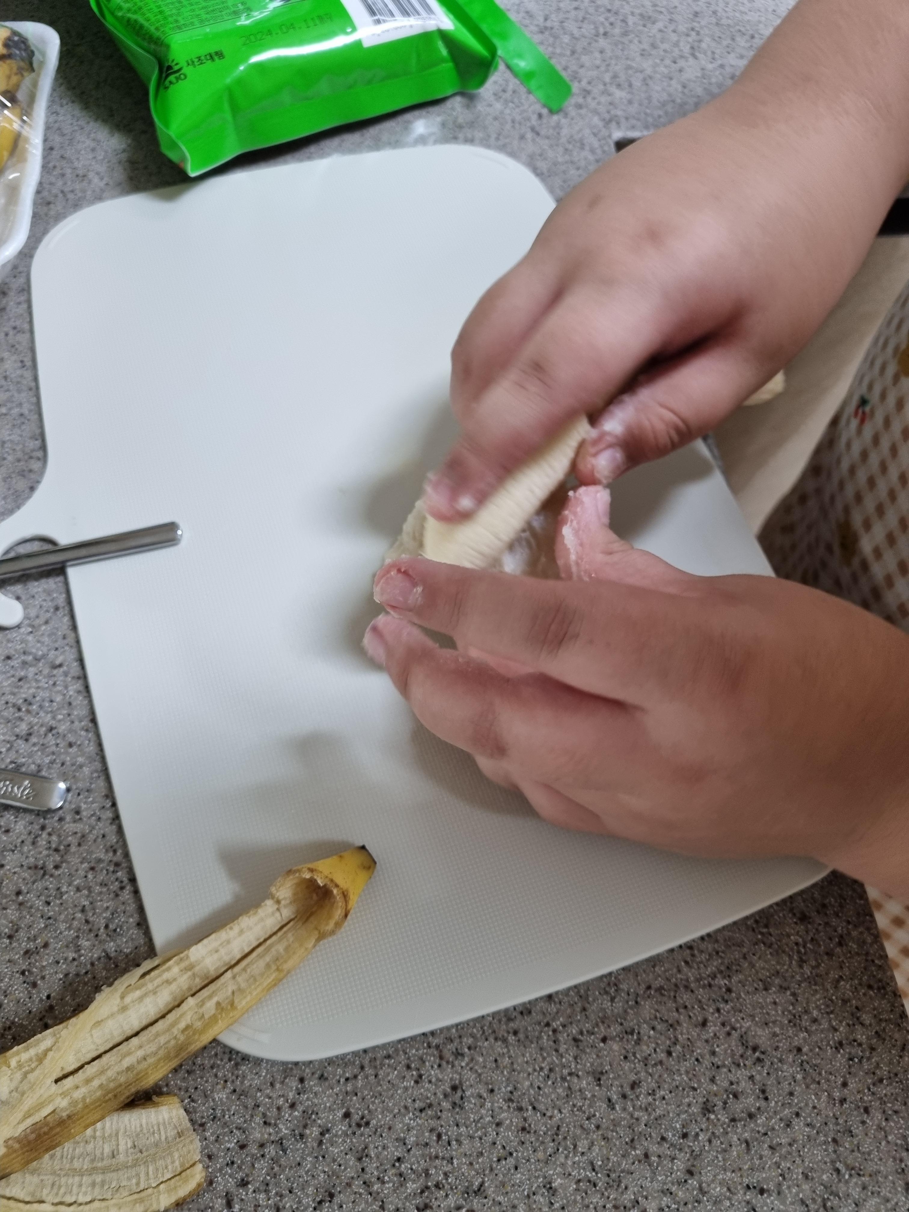 재료 : 찹쌀가루 종이컵 반컵, 생수반컵, 양갱 1개, 바나나 1개