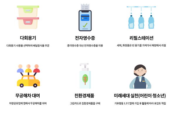 - 재사용 가능한 용기 사용 : 테이크아웃 음식을 주문할 때 재사용 가능한 용기를 사용하면 포인트를 적립할 수 있습니다.
