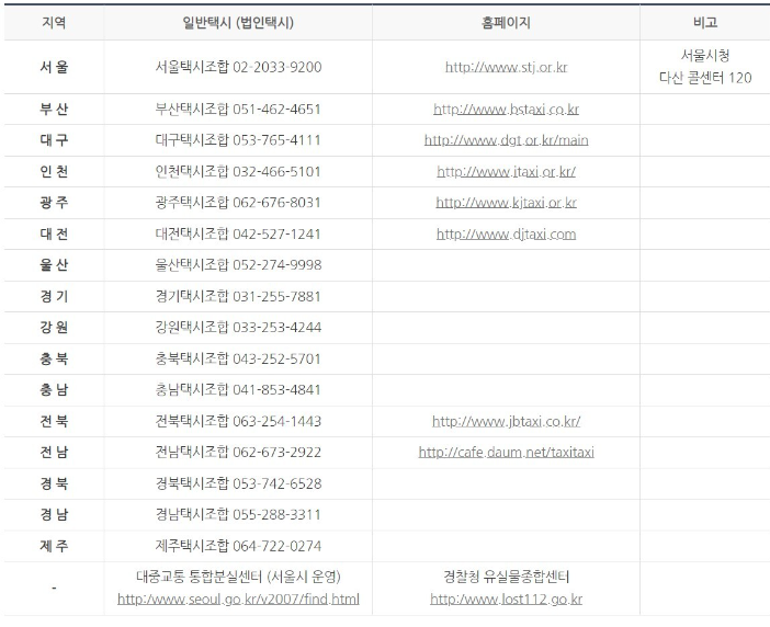 지역별 택시 분실물 찾는 문의처는 아래와 같습니다.