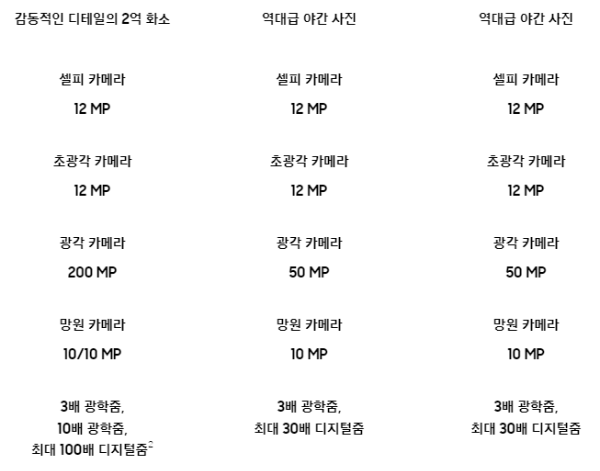 울트라의 경우는 2억 화소 사용과 최대 100배 디지털줌 확대가 가장 큰 차이점입니다. 달 사진 촬영으로 아이폰과 많이 비교되어 나오곤 하는 부분입니다.