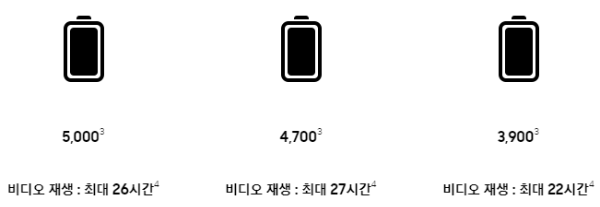 배터리를 많이 소모하는 비디오 재생을 기준으로 울트라의 경우는 최대 26시간, 플러스는 최대 27시간, 일반은 최대 22시간 동안 배터리 연속 사용이 가능합니다.